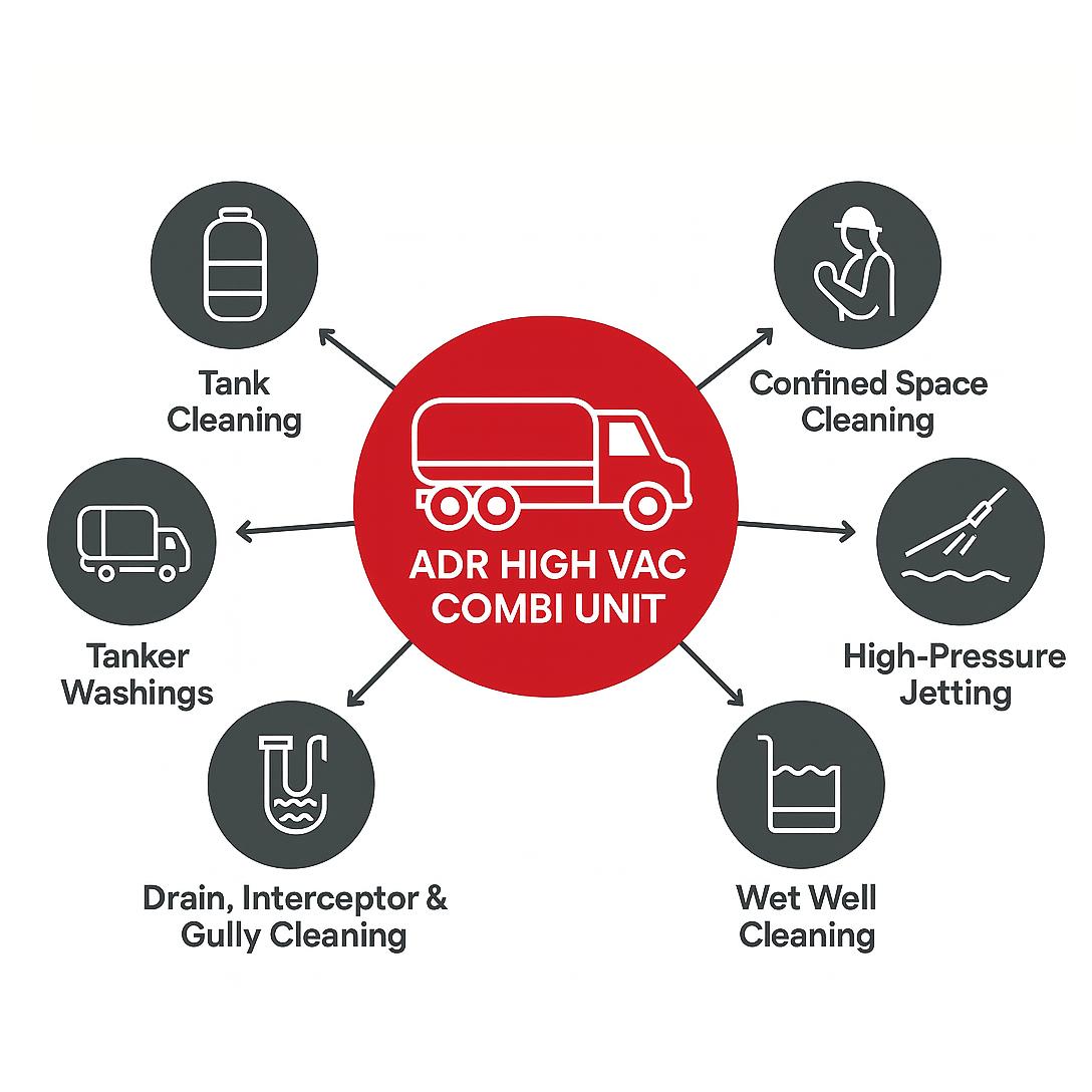At the heart of our industrial cleaning capability is the ADR High Vac Combi Unit, designed for hazardous and non‑hazardous waste removal.