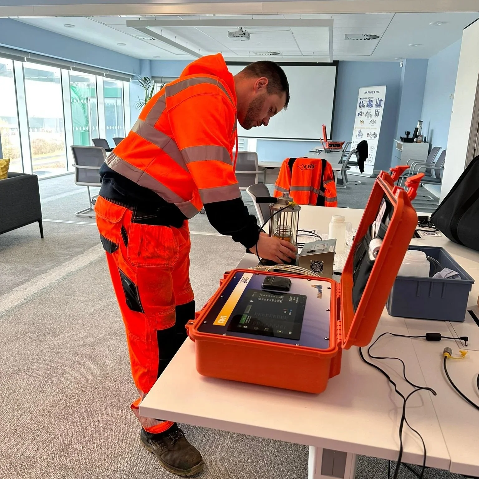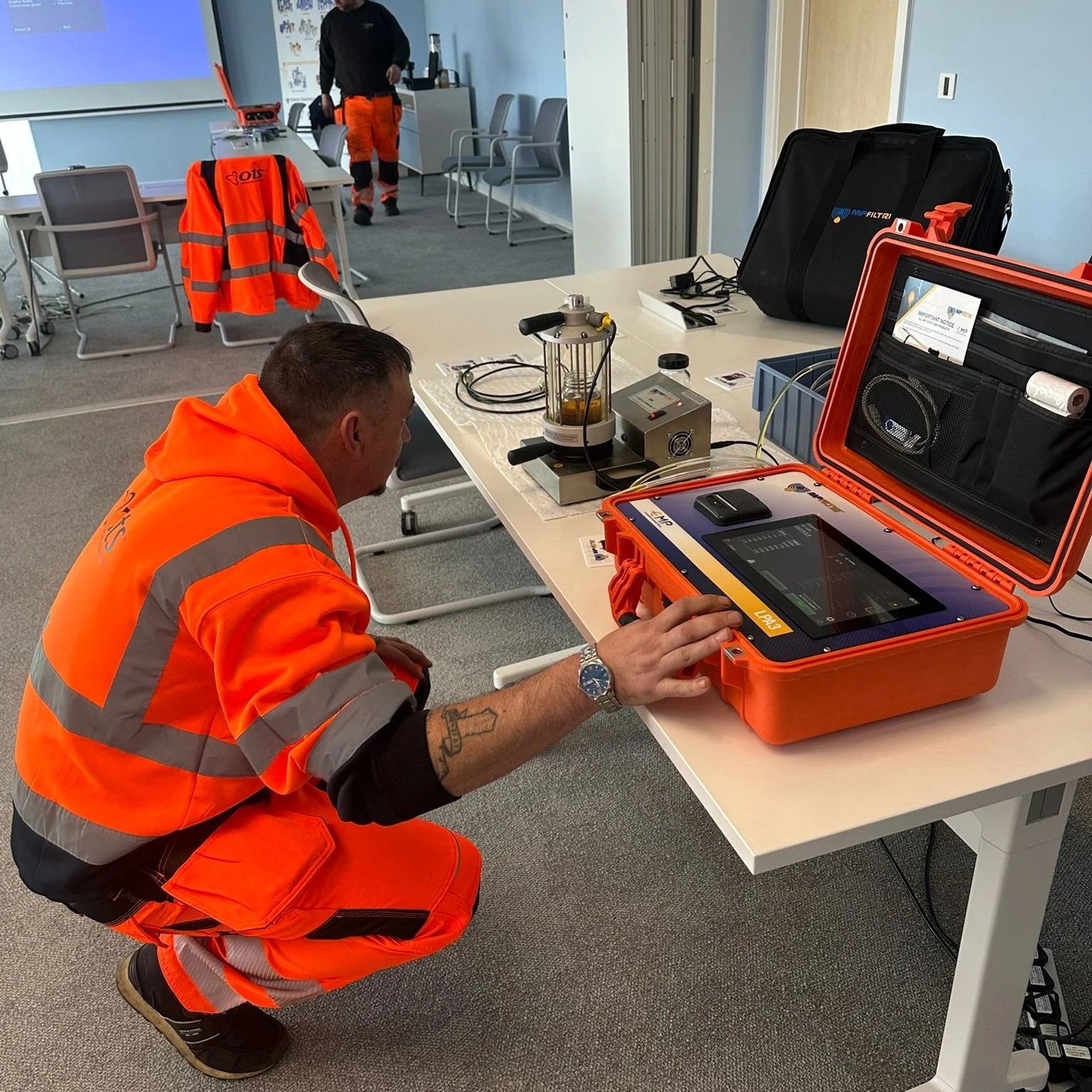 OTS engineers receiving hands-on training with the MP Filtri fuel condition monitoring equipment used to measure particulate contamination during fuel polishing.